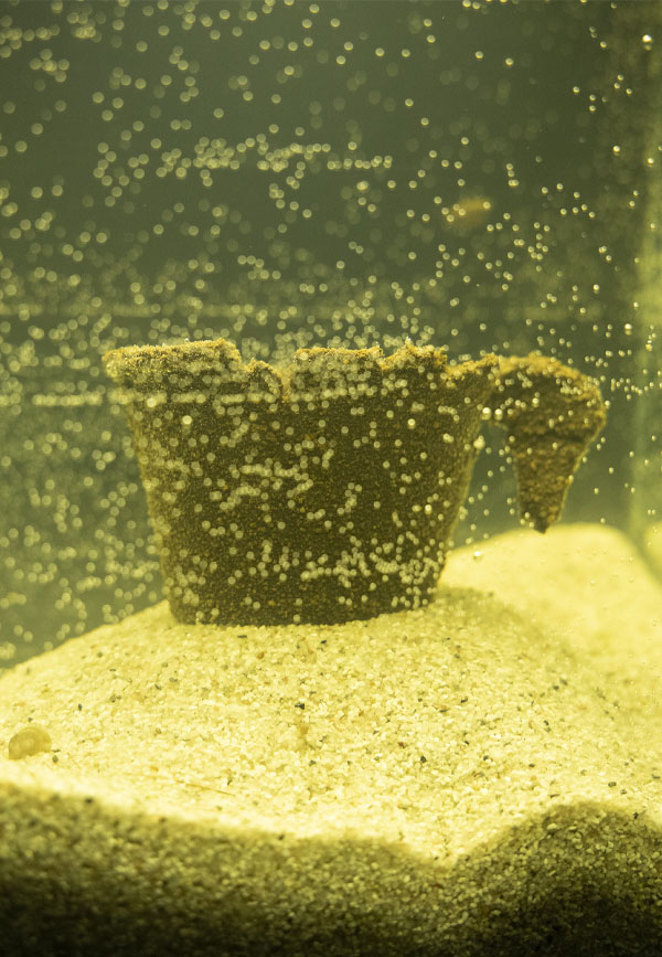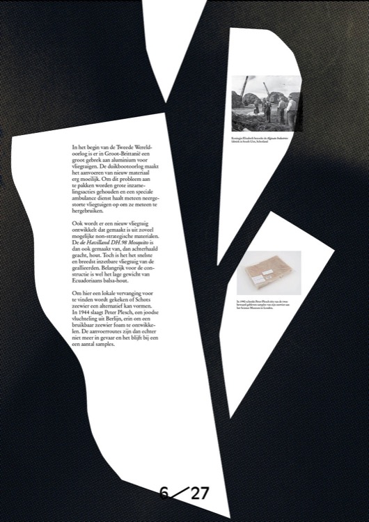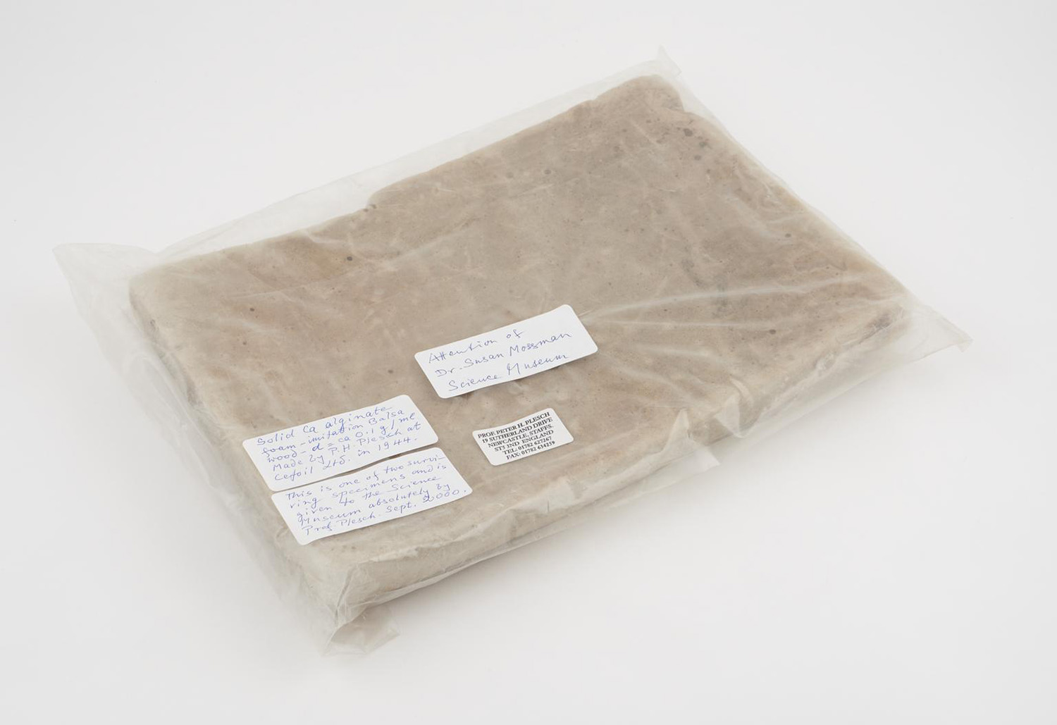 Slab of solid Ca alginate foam. Made in imitation of balsa Wood (as a substitute for use in the Mosquito Aeroplane). Density is ca. 0.1g/ml. Made by P.H. Plesch at Cefoil Ltd, 1944. Collection Science Museum London.